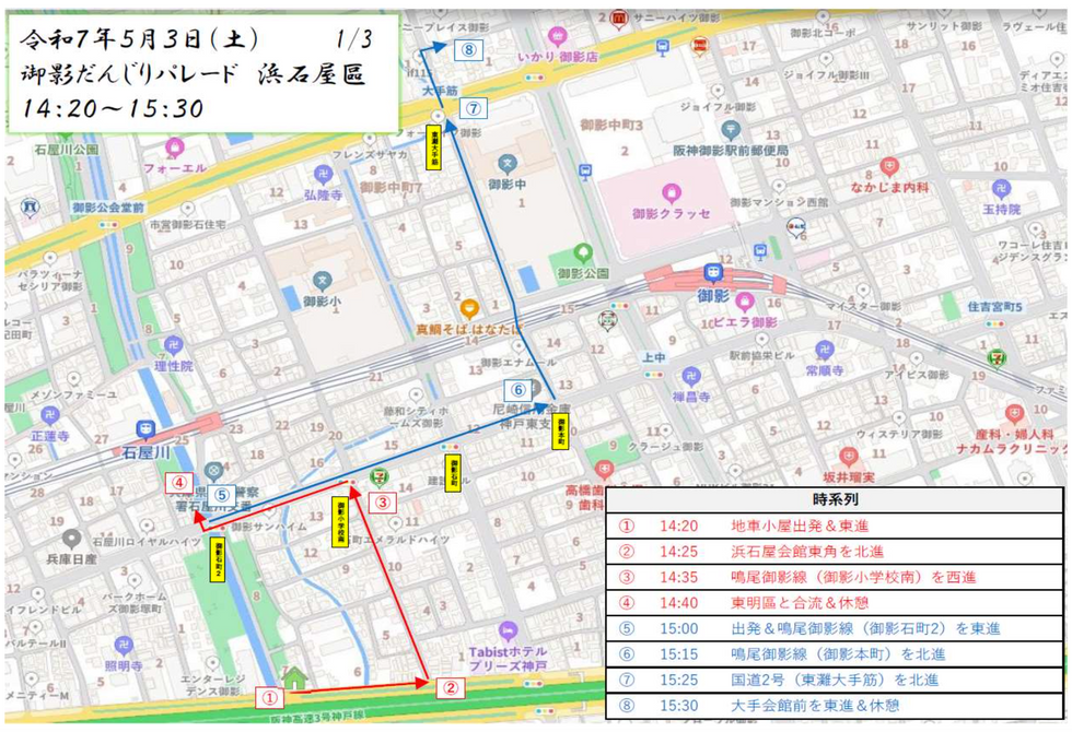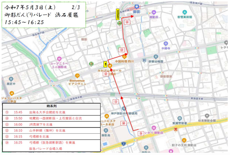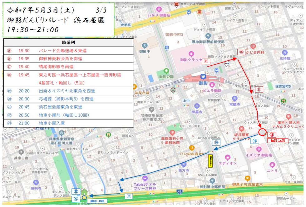また、本年はパレード後、東ノ町・上石屋・西御影・浜石屋の4地区による合同練り回しがあります。